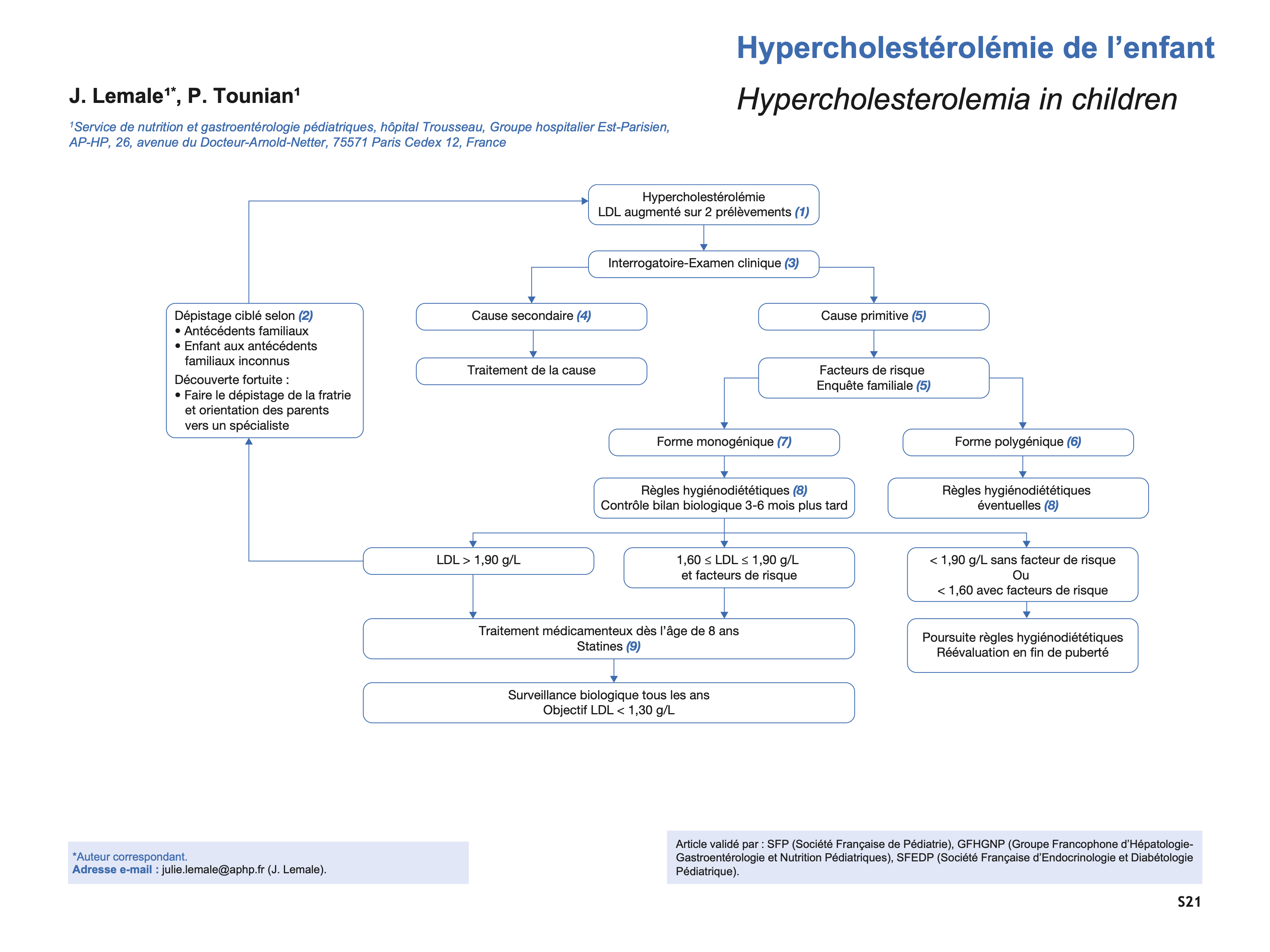 (2) Actuellement, un dépistage ciblé de la population pédiatrique, réalisé en cas d’antécédents familiaux d’HCF et/ou d’accidents vasculaires précoces, semble raisonnable : il doit être fait à partir de 6-8 ans, voire plus tôt s’il y a une suspicion d’HCF homozygote ou si les parents le souhaitent. Le dépistage concerne également les enfants dont les antécédents familiaux sont inconnus (enfants adoptés, naissance par procréation médicalement assistée [PMA] ou gestation pour autrui [GPA]).